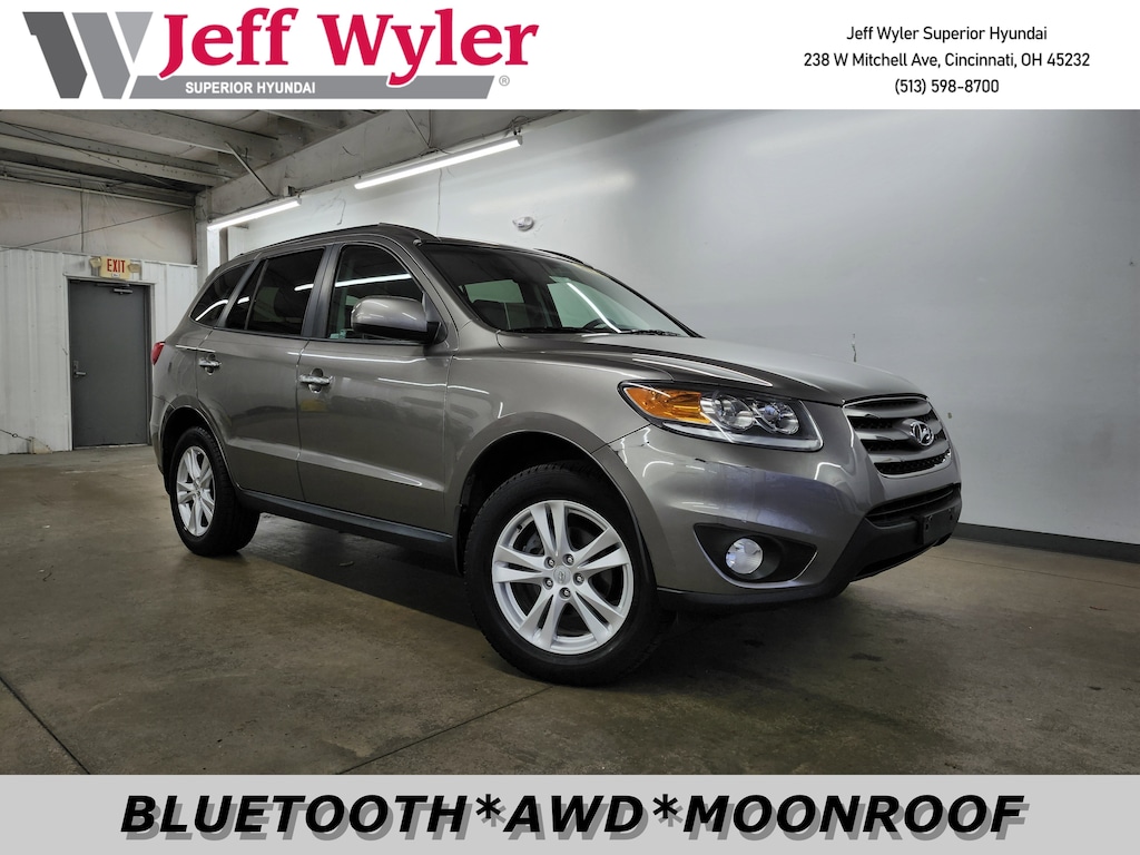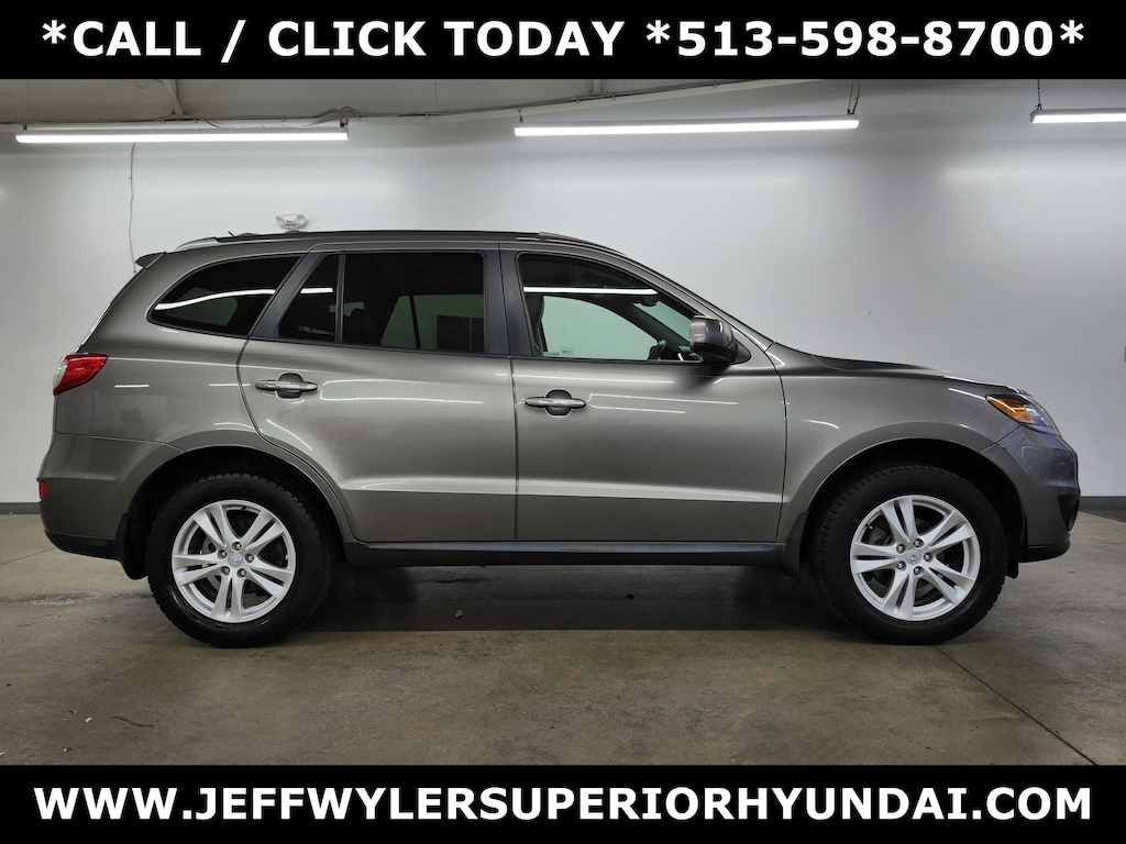 Jeff Wyler Superior Hyundai is pumped up to offer this outstanding-looking 2012 Hyundai Santa Fe Limited in Mineral Gray. Well equipped with: Option Group 01 (115-Volt Power Outlet, 4-Wheel Disc Brakes w/ABS, Active Front Head Restraints, Advanced Front Airbags, Automatic Headlights, Body-Color Exterior Mirrors, Body-Color Rear Spoiler, Chrome Accent Exterior Door & Liftgate Handles, Compass, Deluxe Metal Accent Door Scuff, Downhill Brake Control, Dual Front Automatic Temperature Control, Electrochromic Auto-Dimming Rear-View Mirror, Electronic Stability Control, Front Fog Lights, Front Solar Glass, HomeLink Integrated Transceiver, Integrated Bluetooth® Hands-Free Phone System, Leather-Wrapped Steering Wheel & Shift Knob, Multi-Function Trip Computer, Power Door/Tailgate Locks, Power Driver Seat w/Power Lumbar Support, Power Tilt-and-Slide Glass Sunroof, Power Windows, Rear Privacy Glass, Remote Keyless Entry System w/Alarm, Roof Rack Cross Rails, Roof Rack Side Rails, Steering-Wheel-Mounted Audio & Cruise Controls, Sun Visors w/Illuminated Vanity Mirrors, Tilt & Telescopic Steering Wheel, Tire Pressure Monitoring System, Windshield Wiper De-Icer, and Woodgrain Trim), AWD, Black Leather, 10 Speakers, 18" x 7" Euroflange Aluminum Alloy Wheels, 3.20 Axle Ratio, 4-Wheel Disc Brakes, 5-Passenger Seating, ABS brakes, Air Conditioning, Alloy wheels, AM/FM radio: XM, Anti-whiplash front head restraints, Auto-dimming Rear-View mirror, Automatic temperature control, Brake assist, Bumpers: body-color, Carpeted Floor Mats, CD player, Composite Cargo Tray, Driver door bin, Driver vanity mirror, Dual front impact airbags, Dual front side impact airbags, First Aid Kit, Four wheel independent suspension, Front anti-roll bar, Front Bucket Seats, Front Center Armrest w/Storage, Front dual zone A/C, Front fog lights, Front reading lights, Fully automatic headlights, Garage door transmitter: HomeLink, Heated door mirrors, Heated front seats, Heated Multi-Adjustable Front Bucket Seats, Illuminated entry, Leather Seating Surfaces, Leather Shift Knob, Low tire pressure warning, Mudguards, Occupant sensing airbag, Outside temperature display, Overhead airbag, Overhead console, Panic alarm, Passenger door bin, Passenger vanity mirror, Power door mirrors, Power driver seat, Power moonroof, Power steering, Power windows, Radio: Infinity Logic 7 AM/FM/XM/MP3 6-Disc CD, Rear anti-roll bar, Rear seat center armrest, Rear window defroster, Rear window wiper, Remote keyless entry, Roof rack, Security system, Speed control, Split folding rear seat, Spoiler, Steering wheel mounted audio controls, Tachometer, Telescoping steering wheel, Tilt steering wheel, Traction control, Traction Control System, Trailer Pre-Wiring, Transmission Fluid Cooler, Trip computer, Upgraded Radiator, and Variably intermittent wipers. Clean CARFAX. This sales price excludes tax, title, and dealer fees. While every reasonable effort is made to ensure the accuracy of this information, we are not responsible for any errors or omissions contained on these pages. Used vehicles 10 years of age or newer with less than 100,000 miles are eligible for the Wyler Assurance Program, but eligible vehicles must pass our reconditioning process and multi-point inspection. Provided the vehicle passes inspection, vehicles will be eligible for the 6 month/6,000 mile limited warranty. The 6 month/6,000 mile limited warranty is NOT available on AS-IS vehicles, wholesale vehicles, lease buyback/pass-thru vehicles or un-inspected vehicles. Note that this program can also apply to vehicles where the remaining factory coverage is less than 6 months or 6,000 miles. Please check the Federal Trade Commission (FTC) Buyers guide on the vehicle for full details as to whether or not warranty coverage may apply. Contact Dealer for additional details. The Wyler Assurance 6 month/6,000 Mile limited warranty ends 6 months from the date of the Retail Purchase Agreement (BUYERS ORDER) or when the vehicle's odometer regi