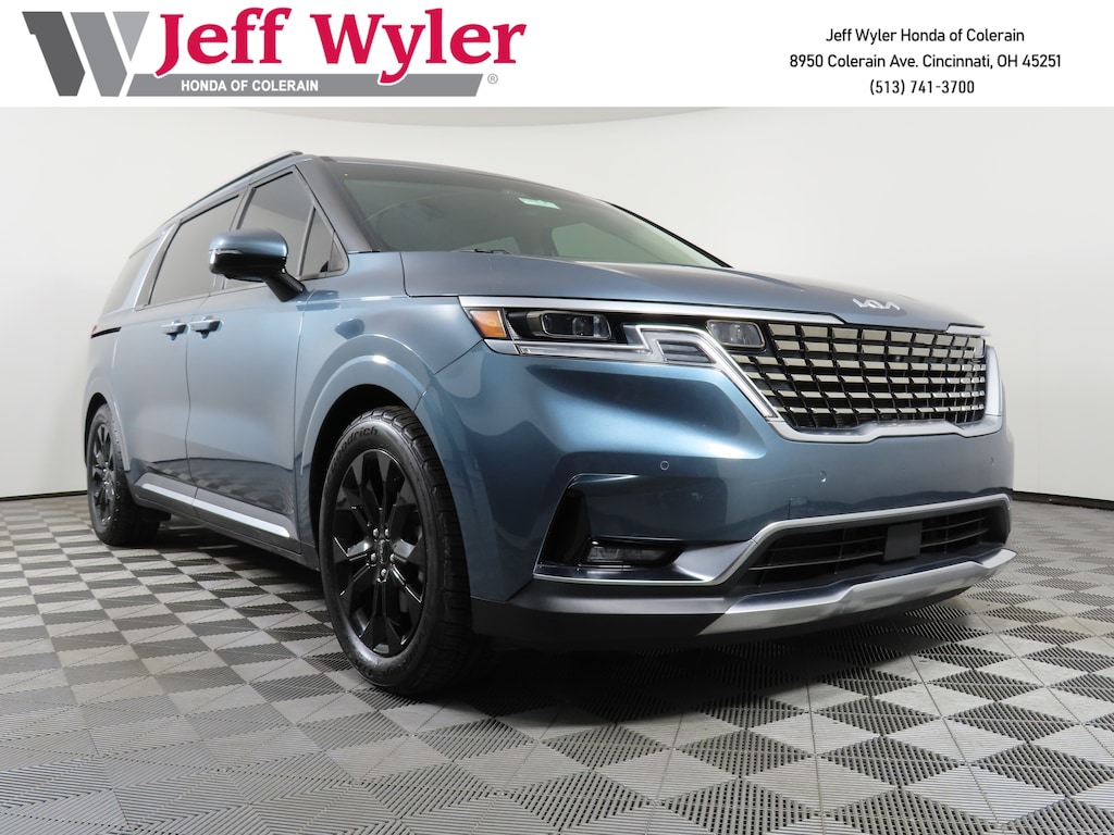 Jeff Wyler Honda of Colerain is very proud to offer this handsome 2022 Kia Carnival SX Prestige in Astra Blue. Well equipped with: 12 Speakers, 3.51 Axle Ratio, 3rd row seats: split-bench, 4-way Power Driver's Lumbar Support, 4-Wheel Disc Brakes, 8 Way Power Driver's Seat, 8 Way Power Front Passenger's Seat, ABS brakes, Air Conditioning, Alloy wheels, AM/FM radio: SiriusXM, Apple CarPlay & Android Auto, Auto High-beam Headlights, Auto-dimming Rear-View mirror, Automatic temperature control, Brake assist, Bumpers: body-color, Cargo Mat, Compass, Delay-off headlights, Driver door bin, Driver vanity mirror, Driver's Seat & Mirrors Memory System, Dual front impact airbags, Dual front side impact airbags, Electronic Stability Control, Emergency communication system: UVO eServices, Four wheel independent suspension, Front anti-roll bar, Front Bucket Seats, Front Center Armrest, Front dual zone A/C, Front fog lights, Front reading lights, Fully automatic headlights, Garage door transmitter: HomeLink, Heated & Ventilated Front Bucket Seats, Heated door mirrors, Heated front seats, Heated rear seats, Heated steering wheel, Illuminated entry, Knee airbag, Leather Shift Knob, Leather steering wheel, Low tire pressure warning, Luxury Carpeted Floor Mats, Memory seat, Navigation system: UVO eServices, Occupant sensing airbag, Outside temperature display, Overhead airbag, Overhead console, Panic alarm, Passenger door bin, Passenger vanity mirror, Power 2nd-Row Moonroof, Power door mirrors, Power driver seat, Power Liftgate, Power moonroof, Power passenger seat, Power steering, Power windows, Pure Leather Seat Trim, Radio: AM/FM/HD Audio System, Rear air conditioning, Rear anti-roll bar, Rear reading lights, Rear window defroster, Rear window wiper, Reclining 3rd row seat, Remote keyless entry, Roof rack: rails only, Security system, Speed control, Speed-sensing steering, Split folding rear seat, Spoiler, Steering wheel mounted audio controls, Tachometer, Telescoping steering wheel, Tilt steering wheel, Traction control, Trip computer, Turn signal indicator mirrors, Variably intermittent wipers, Ventilated front seats, Ventilated rear seats, and Wheels: 7.5J x 19" Black Painted Alloy.